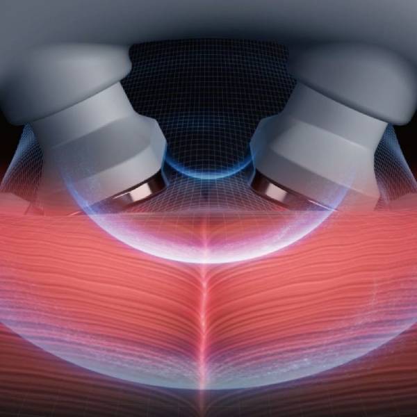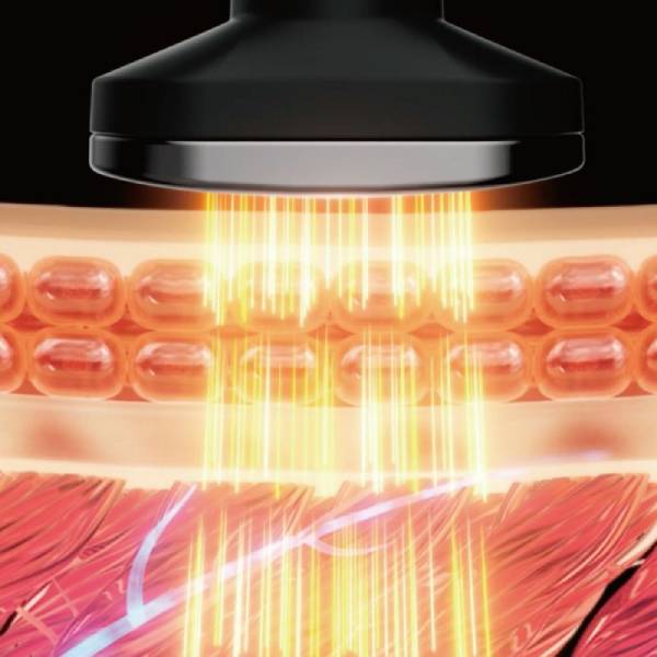 中周波EMSによる筋肉刺激と、モーターによる物理的な振動、赤色LED、ヒーターによる直感的な温かさ、異なる4つの機能が組み合わさる事で立体的で、やさしい使い心地を実現しています。