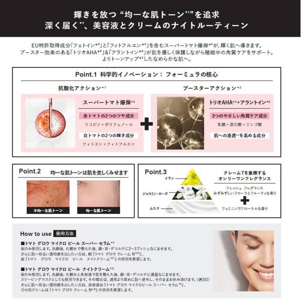 EU特許取得成分「フェトイン*³」と「フィトフルエン*³」を含むスーパートマト爆弾*⁴が、輝く肌へ導きます。