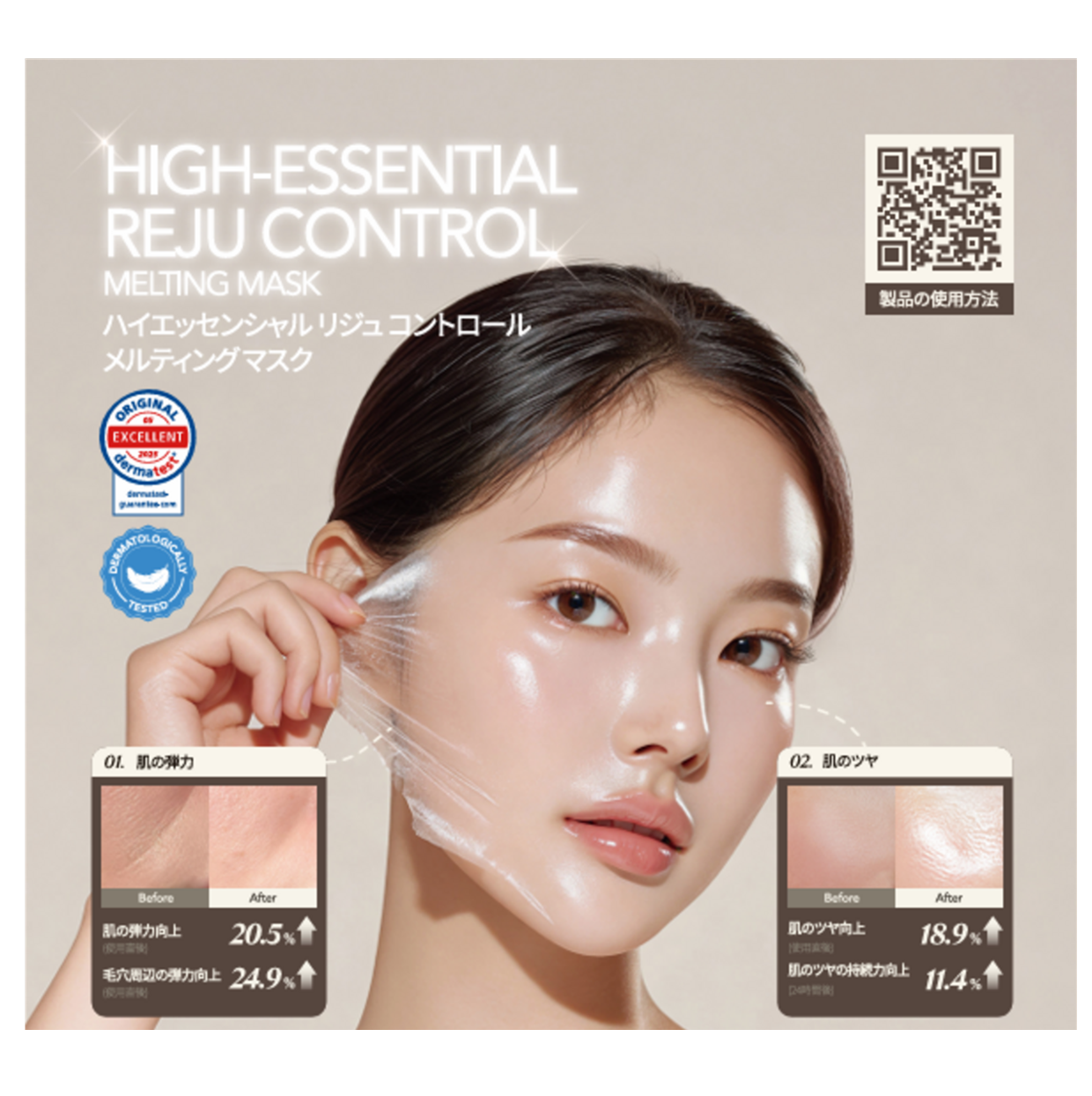 塗布後約20分で皮膜を形成し、密着した状態で美容成分を角質層まで届けます。拭き取り・洗い流し後は、内側から潤ったようなハリと艶を実感いただけます。
